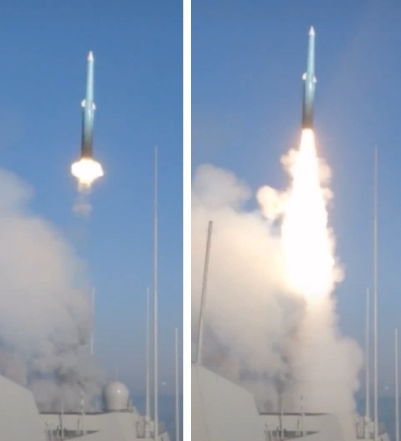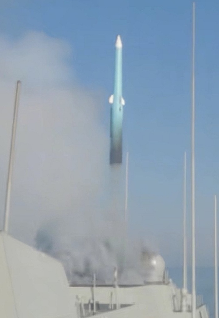 (上與下二張)2022年4月20日,中國海軍透露的視頻中,一艘055導彈驅逐艦 後部垂直發射器發射一枚新型號導彈,就是鷹擊20(早期認為是鷹擊21) 高超聲速反艦導彈。