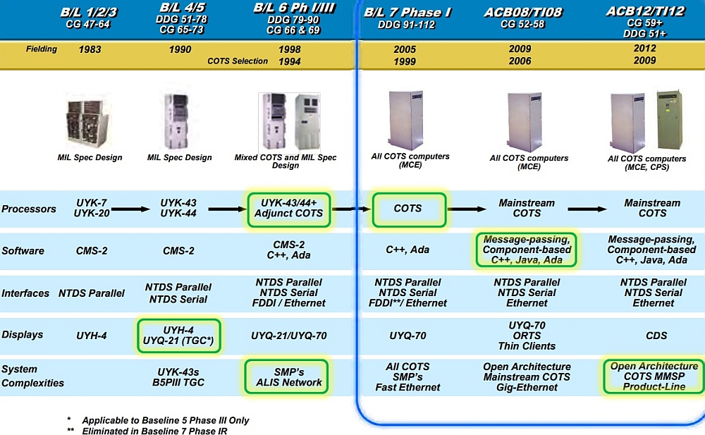 9的ACB12/TI-12時,CPS的技術正式定型完備,並被賦予AN/UYQ-107 的軍用型號(見下文)。 4.朝虛擬化的過渡期 雖然TI-08引進了商規伺服器,但當時(2000年代前半)的虛擬化技術(Hypervisor)不夠成熟,且當時商規伺服器的Intel Xeon算力沒有沒強到可以執行虛擬化層。例如雷達火控要求延遲在微秒級,SPY-1雷達信息經虛擬機器處理網路封包經多次軟體轉換(如虛擬交換機),這些延遲導致雷達即時反饋信息產生抖動(Jitter)。而神盾系統射控指令必須在極精確的時間點執行,當時的虛擬技術無法確保延遲幅度的確定性 (Determinism),戰術運算只能暫停。 因此,當時並沒有把原本在UYK-43或UYQ-70上執行的軟體連硬體行為「封裝」成虛擬機器,而是分別採取「原生執行 」(Native Execution)」、軟體模擬(Software Emulation)、「中間件化」等措施。 「原生執行」是將原本在UYQ-70執行的C++或ADA程式(跑在LynxOS或 Solaris作業系統),編譯成在TI-08硬體上的Red Hat Enterprise Linux (RHEL)執行的二元執行檔(binary)。「軟體模擬」是通過美國海軍工程師開發、能在Linux伺服器(X86處理器)上模擬舊軍規電腦的指令集模擬器 (Instruction Set Simulator),模擬UYK-43的32位元指令集架構、暫存器以及特有指令集(ISA)等行為,讓原本在UYK-43電腦的二元執行檔原封不動地在TI-08的Intel x86處理器直接。 「中間件」則是透過外部的數據分派服務(DDS)來支持不同戰術應用程式間的溝通,每個戰術應用程式依照DDS的信息格式將資料丟到DDS匯流排上,由TI-08商規伺服器上的軟體接收並解算,算出後再經DDS傳到顯示終端渲染成畫面。此外,也有透過硬體模擬(Emulation,在商規硬體上模擬舊軍規電腦的底層行為),讓新的商規伺服器執行原本在UYK-43計算機運行的部分程式。 對於某些極度複雜、不適合重寫或轉譯的舊程式邏輯(例如某些特定的反潛或導航演算法),美國海軍選擇不重新編譯,直接將這些程式原有的二進位代碼在這個軍規電腦軟體模擬器上執行。由於TI-08的Intel Xeon 處理器時脈(GHz 等級)遠高於 UYK-43(MHz 等級),即使運行軟體模擬層難免造成系統的Overhead,原程式在「虛擬UYK-43」上運行速度還是高於在原本真實UYK-43機器上。 雖然這種軟體模擬可以方便地直接執行舊軍規電腦的軟體執行檔,但這無法發揮新硬體的優勢(例如多核心並行處理)。因此,對於一些運算量大的工作如主要的決策跟運算,美國海軍選擇以「原生執行 」策略,將這些軟體的CMS-2原始碼編譯出在Linux上執行的執行檔;而一些對穩定性要求極高但運算量較小、日後不太需要變動的邏輯,就維持原樣,直接將舊機器的執行檔通過軟體模擬器執行。 神盾Baseline 8是第一個以神盾開放架構(AEGIS Open Architecture,AEGIS OA)實作軟體的版本。過去神盾Baseline 7的軟體雖然大量使用ADA乃至於C++等高階語言,但不同軟體模組之間依然存在高度的依賴性,升級一個模組往往需要連動修改數十個部分。而到了神盾Baseline 8/TI-08,透過資料分派服務 DDS) 中介軟體,將「感測器數據」與「武器控制邏輯」完全分離,這讓海軍可以單獨升級雷達軟體或飛彈的導引代碼,而不會彼此牽連。 5.資料傳輸頻寬的重大升級